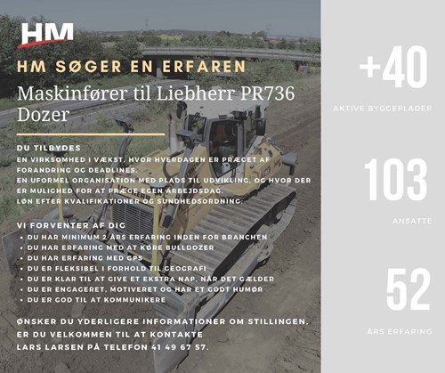 HM søger en erfaren maskinfører til en Liebherr PR736 Dozer til anlægsprojekter i hele Danmark.