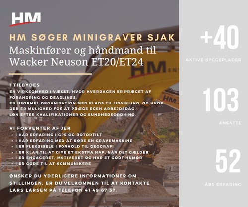 HM søger en erfaren maskinfører og en håndmand - et fast sjak - til en Wacker Neuson ET20/ET24 minigraver til anlægsprojekter i hele Danmark.
